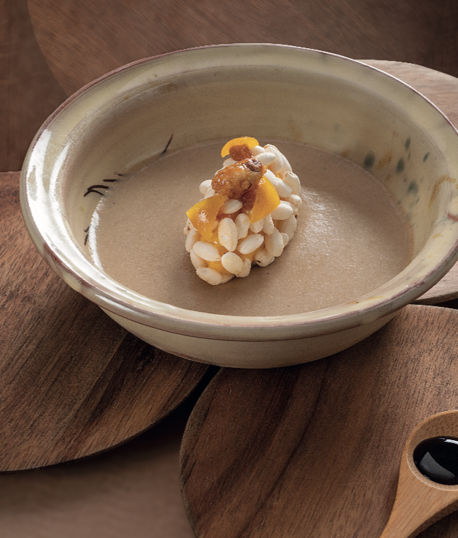 Déposer une quenelle de sorbet mangue-riz soufflé sur la préparation de bananes.
