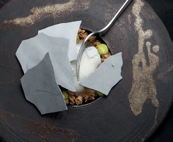 Il équilibre la richesse du pesto et du crumble tout en rehaussant la fraîcheur du citron confit et du sorbet, tandis que sa profondeur met en valeur la finesse de la meringue au charbon végétal.