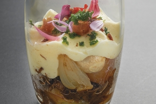 Dans une verrine, dresser le boeuf bourguignon puis la mousse de pomme de terre. Parsemer oignons grelots, croûtons de pain de mie, persil haché et lardons.