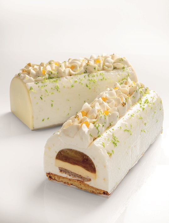 Couler la mousse citron vert dans le moule à bûche, insérer l’insert, compléter avec la mousse et fermer avec le sablé breton. Congeler.