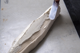 Sortir du congélateur et rendre l’aspect extérieur irrégulier, à l’aide d’un couteau, pour lui donner l’apparence d’un morceau de bois. Replacer au congélateur.