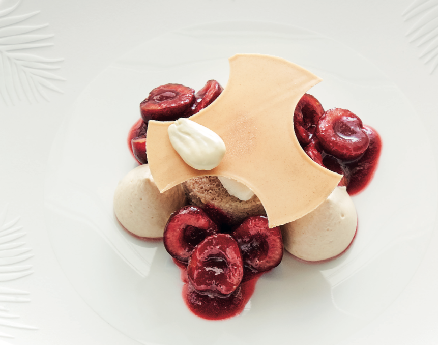 Pocher trois gros points de ganache montée à l’amande. Réaliser une quenelle de sorbet à l’amande et la poser sur le baba. Couvrir du décor chocolat-amande. Dresser les cerises cuisinées et leur jus réduit, puis terminer par une amande fraîche mondée.
