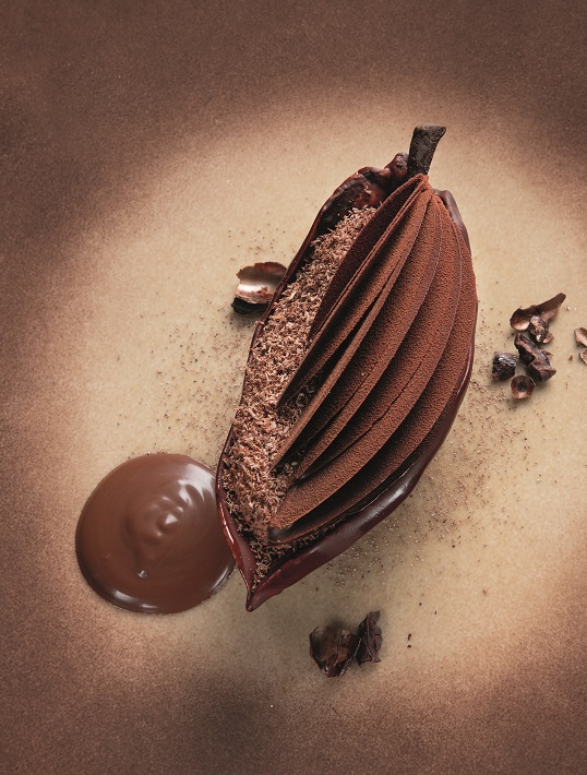 Dans une cabosse de meringue préalablement floquée, ajouter une quenelle de sorbet mucilage. Lisser avec le dos de la cuillère, puis ajouter successivement le croustillant, la crème chocolat et le gel mucilage. Dresser le siphon chocolat sur le dessus, râper une fève de cacao et placer un décor chocolat sur le côté. Servir avec la sauce chocolat chaude.