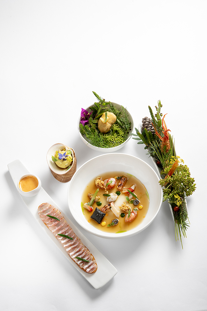 Disposer les coquillages et le rouget grillé. Ajouter la criste, les mini-fenouils, quelques points de rouille et de coulis d’estragon. Verser le bouillon Écosystème.
