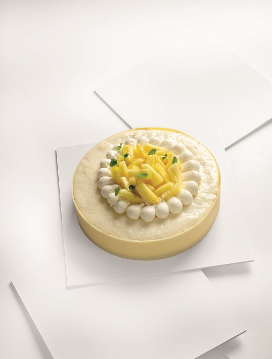 Déposer un disque de dacquoise coco sur l’insert de compotée ananas-passion.