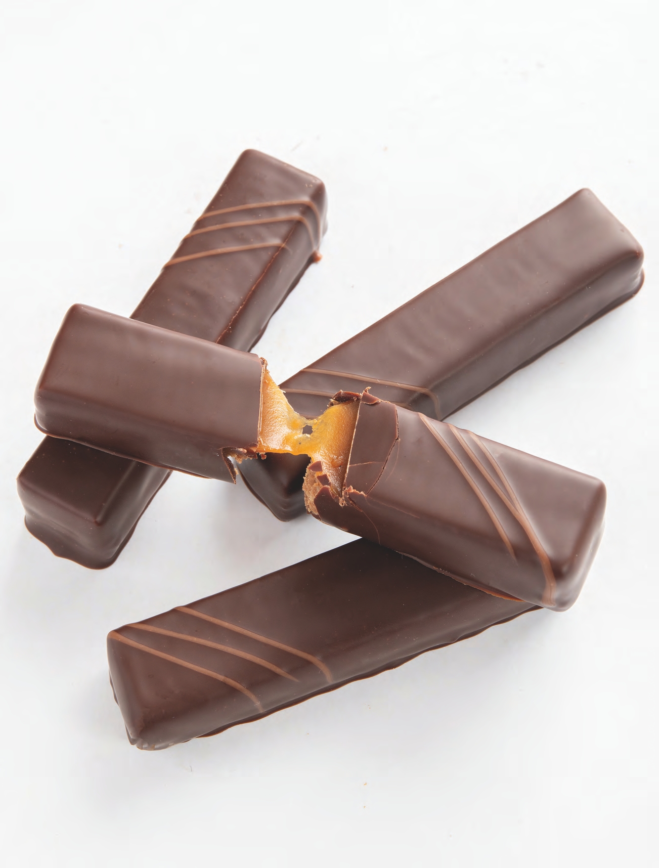 Enrober avec du chocolat noir 66%, décorer avec un trait de chocolat au lait.