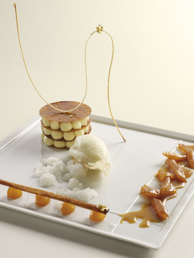 Déposer des billes de poires, les surmonter avec une arlette rectangulaire. Disposer le granité Beaumes-de-Venise, poser dessus un croustillant miel puis une quenelle de sorbet poire.