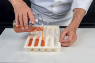 Ajouter la masse gélatine puis refroidir à 25°C, incorporer délicatement la crème montée souple puis couler dans les moules sur le coulis.