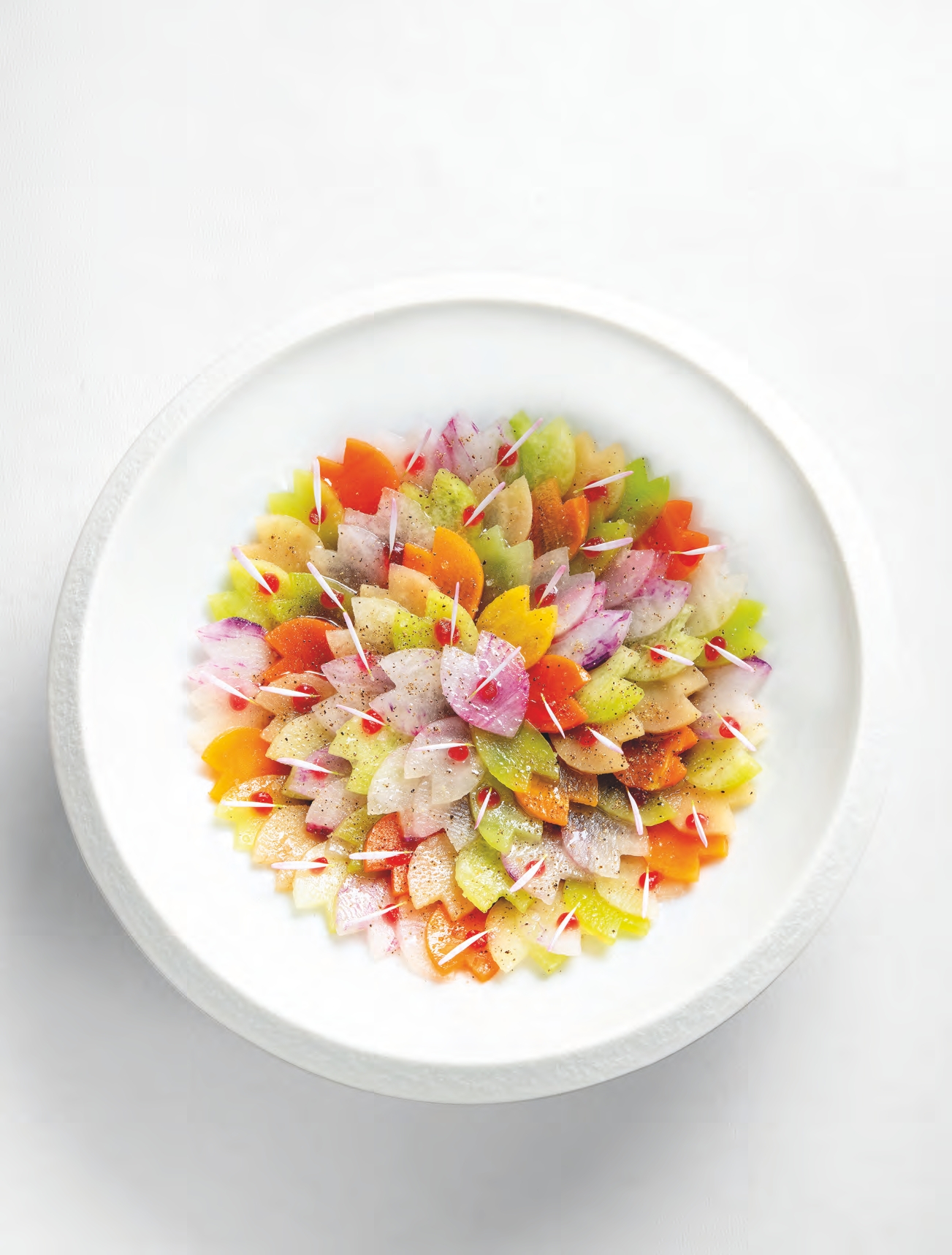 Blanchir les carottes orange, la celtuce, le chou-rave dans une eau parfumée avec la feuille de kaffir (les autres légumes restent crus).
