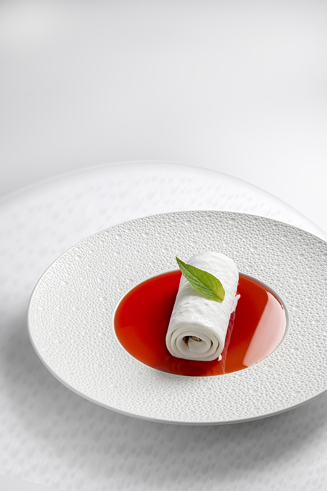 Sur un marbre froid, décoller le papier rhodoïd de la mousse. Étaler de la purée de dattes sur les 3⁄4 de la longueur puis rouler comme une bûche en veillant à bien serrer la souplesse afin d’avoir un résultat régulier. Dresser dans une assiette creuse, disposer une feuille de verveine séchée sur le dessus avec un peu de feuille d’or. Servir l’infusion en saucière.