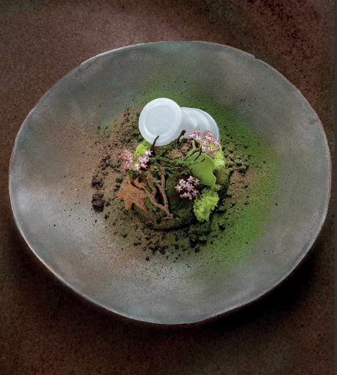 Ajouter du crumble, une boule de sorbet puis le siphon et les poudres.
