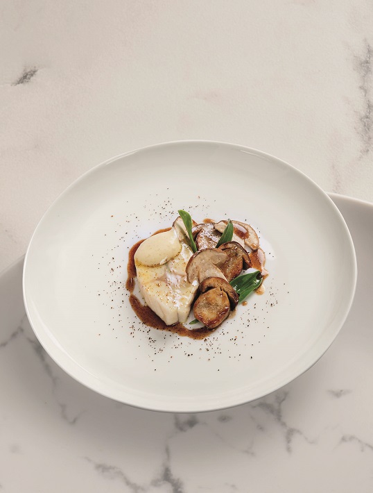 Dans une assiette plate de 25 cm de diamètre, déposer la darne de loup cuite au plat avec le jus de champignon. Snacker les tranches de cèpes et dresser soigneusement en les intercalant avec les copeaux de cèpes taillés minute et les feuilles d’aster maritime. Ajouter un cordon de jus de champignon ayant servi à la cuisson du loup et disposer le sabayon en volume dessus.