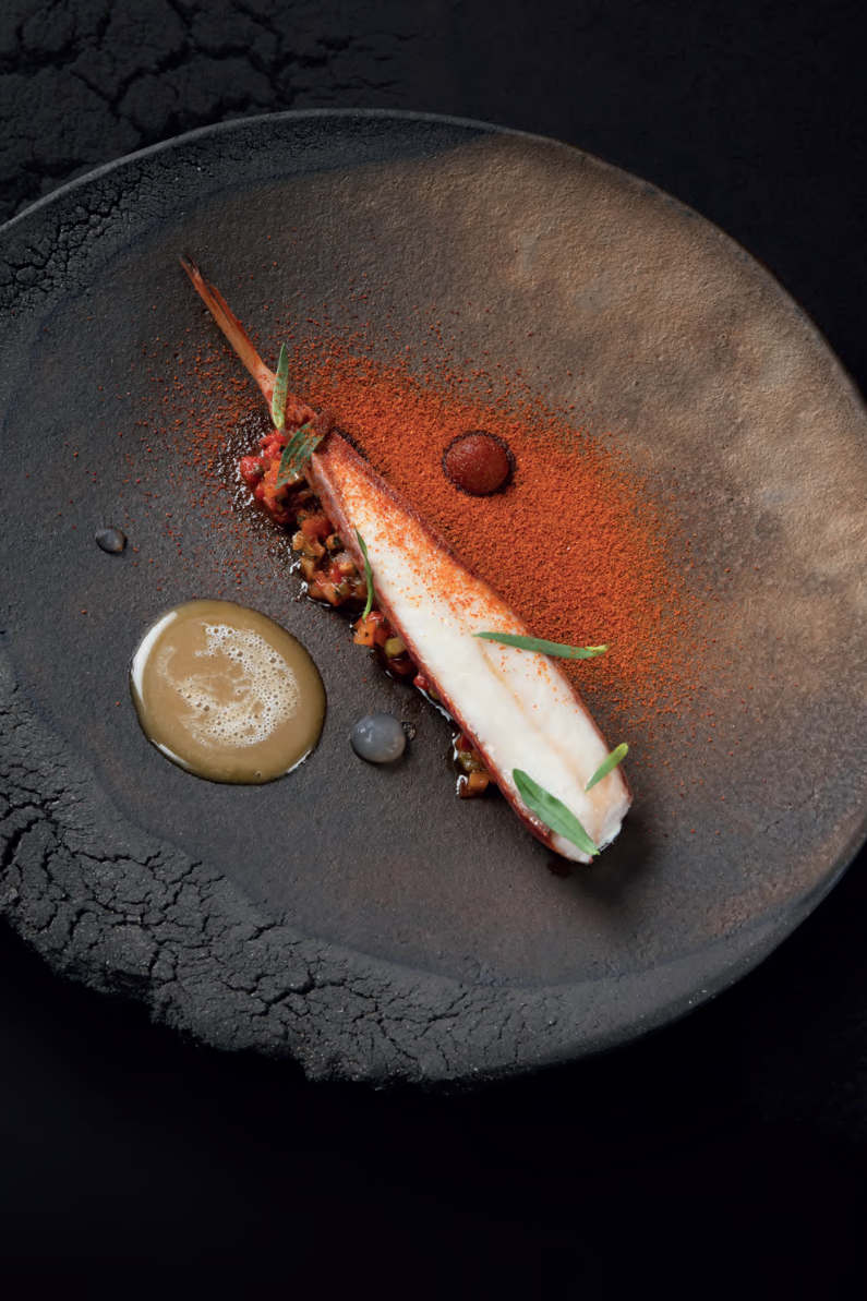 Déposer le condiment poivron sur une partie de l’assiette. Déposer la queue du rouget sur le condiment.