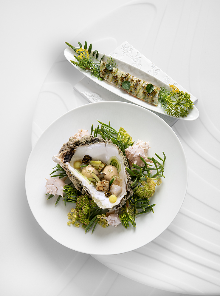 Dans le creux des coquilles, disposer les coquillages, la spirale de seiche, les billes de pomme de terre et l’huître grillée. Ajouter la criste, les peaux de vive taillées, deux points de spoom pomme de terre et saupoudrer de plancton. Verser le bouillon.