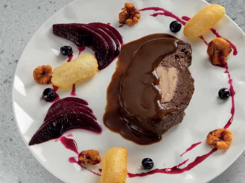 Déposer une tranche au centre de l’assiette, napper la tranche avec la sauce puis disposer les myrtilles et les poires autour.