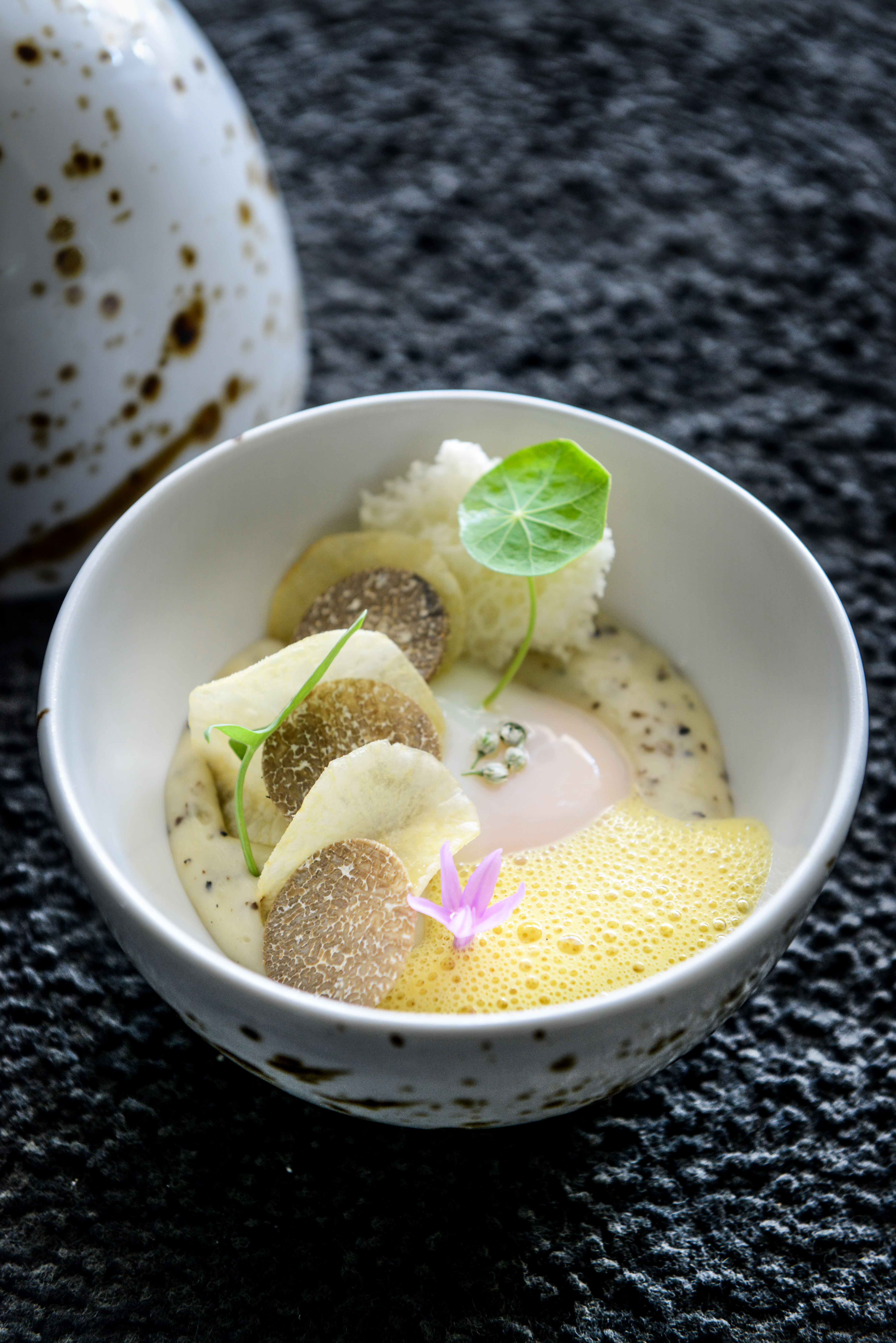 Réchauffer les œufs dans une casserole d’eau tiède (35 - 40°C) pendant 15 minutes ou le même temps à 52°C dans un thermoplongeur. Ajouter l’huile de truffe blanche à la purée de manioc et assouplir le mélange avec la crème fouettée pour avoir une texture onctueuse et aérienne.