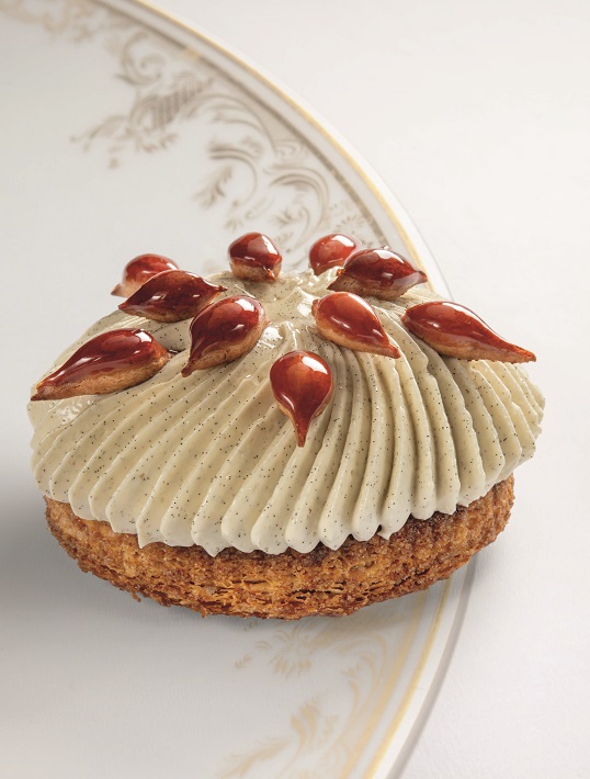 Déposer la crème pâtissière sur le disque de feuilletage. Garnir avec les choux fourrés de caramel. Pocher la chantilly façon Saint-Honoré, napper et disposer les choux glacés.