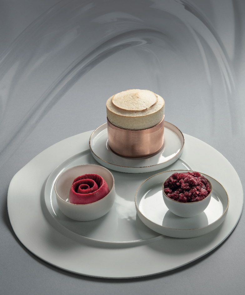 Monter l’appareil à soufflé. Garnir les moules préalable- ment beurrés avec un petit peu d’appareil a soufflé, insérer un biscuit imbibé avec le sirop abricot puis des morceaux d’abricots rôtis. Finir de remplir le moule avec l’appareil à soufflé puis lisser à la spatule. Enfourner pour environ 5 minutes de cuisson dans un four préchauffé à 180°C. Ajouter le granité cassis sur la panna cotta puis disposer un copeau de sorbet dans une coupelle à côté.