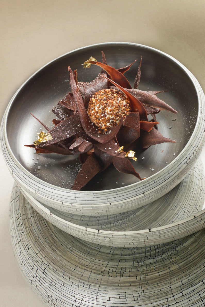 Pocher le crémeux chocolat tout autour du montage puis surmonter avec une boule de mousse sarrasin whisky. Disposer des tuiles de chocolat tout autour.