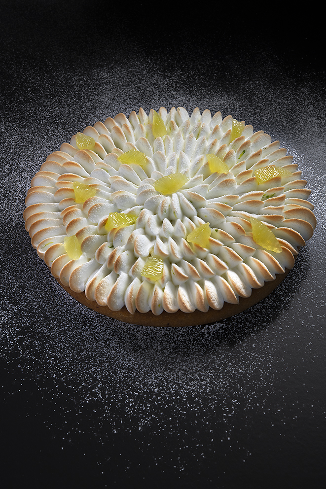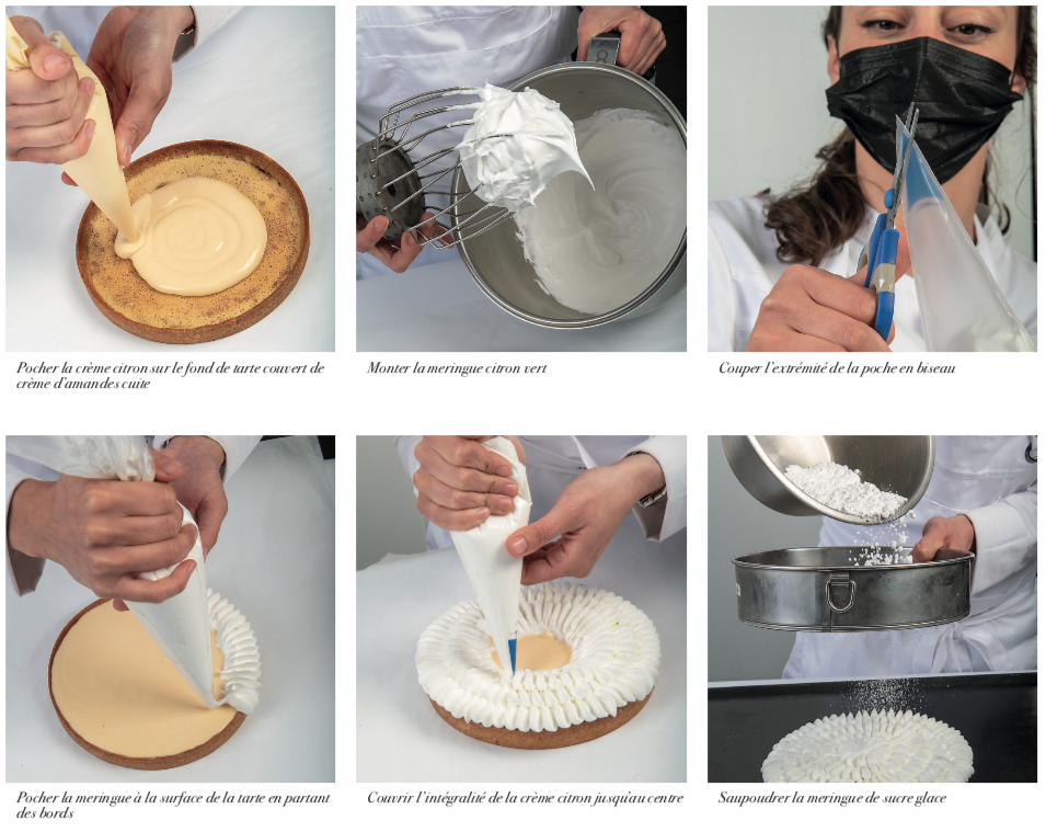 Incorporer délicatement les zestes de citrons verts à l’aide d’une maryse puis verser en poche munie d’une douille Saint-Honoré et recouvrir la tarte de meringue.