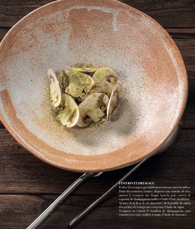 Tailler les champignons en 4, les faire rôtir dans une cocotte-minute jusqu’à obtention d’une belle coloration puis déglacer au vin blanc, et laisser réduire de moitié. Mouiller avec le bouillon de tête et cuire 25 minutes à la cocotte-minute. Filtrer le bouillon à l’aide d’un chinois étamine et rectifier l’assaisonnement.