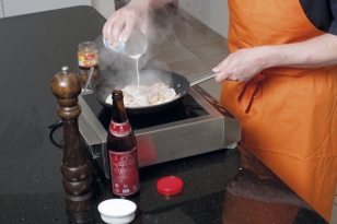 Poêler les gambas à l’huile de sésame, déglacer au lait de noix de coco.